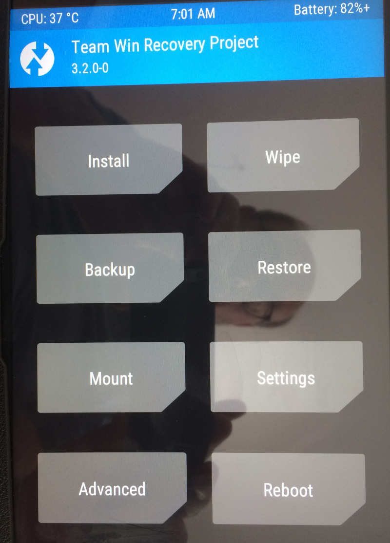 - HOME + Lautstärke+ + Power bootet in den sogenannten Recovery Mode. Hier arbeiten wir dann mit dem TWRP Paket. So etwas wie das Bios mit ein paar Extra Funktionen.