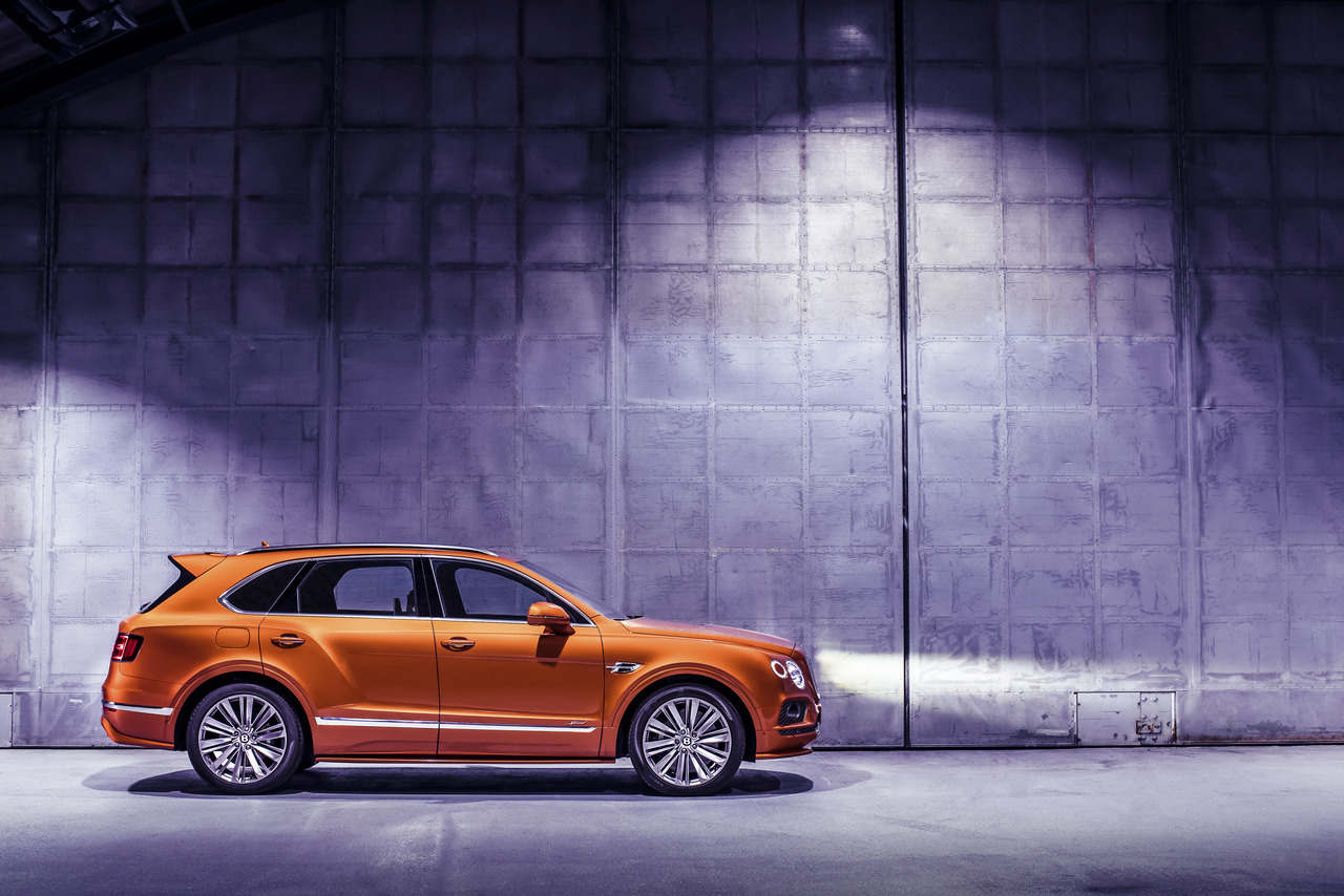 Passend zum höheren Leistungsniveau wartet der Bentayga Speedmit einer imposanten Exterieur-Optik auf. Dunkel getönte Scheinwerfer, Seitenschwellerleisten in Wagenfarbe und ein auffälliger Heckflügel weisen aufdas Leistungsvermögen des SUV hin. Kühler- und Stoßfängergrilleinsätze in dunkler Tönung, ein exklusives 22-Zoll-Raddesign, das mit drei unterschiedlichen Oberflächen verfügbar ist, sowie die typischen Speed-Embleme unterstreichen das sportliche Design.
